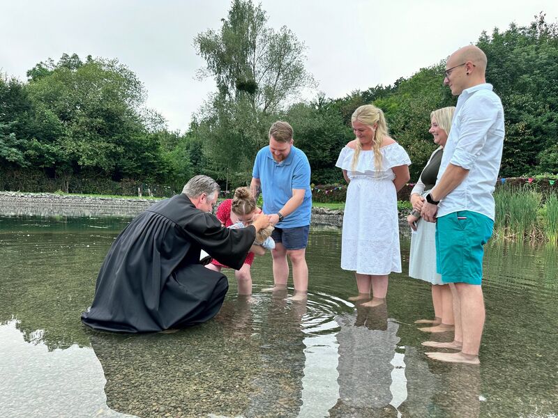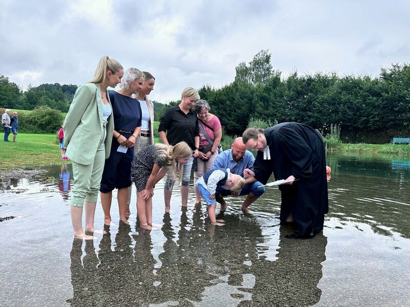 Dann ging es, sichtlich mit Spannung erwartet, knöcheltief ins etwa 19 Grad kalte Wasser. Sechs Kinder wurden bei diesem besonderen Tauffest unter freiem Himmel getauft – und ein Jugendlicher, der auch den Konfirmandenunterricht besucht. Sie heißen Noah Wünsch, Sam Lesch, Emil Ralf Reichelt, Amelie Zenker, Niklas Deppe, Paul Quednau und Karl-Heinz Sahin.