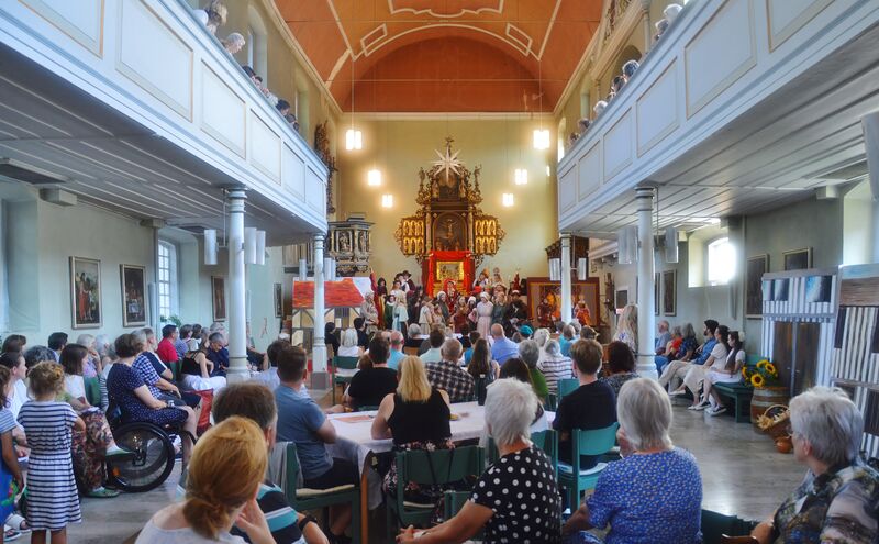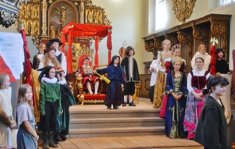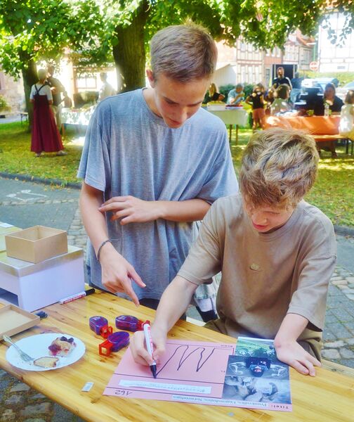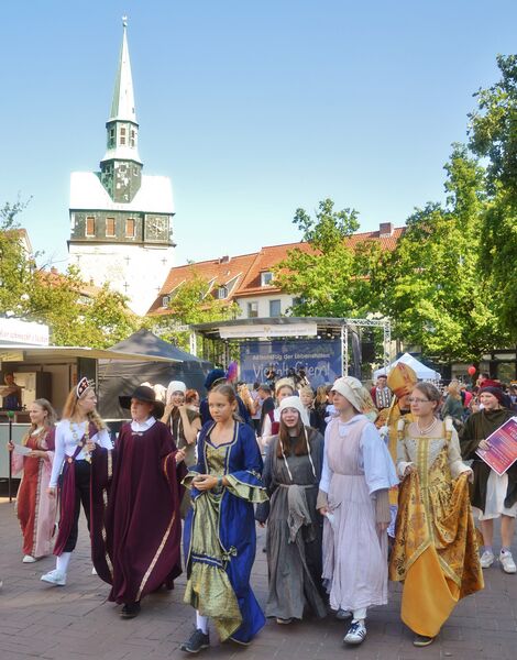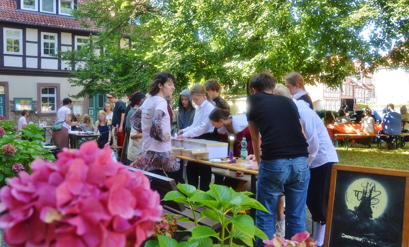 Dieser erste Teil war somit eine ungewöhnliche und bereichernde Erfahrung, die allein es schon wert war, am Fest teilzunehmen. Während die meisten Erwachsenen nun erst einmal Kaffee und Kuchen genossen, warfen sich die Kinder und Jugendlichen in ihre Kostüme und machten sich auf den Weg in die Innenstadt. Dort beim Aktionstag der Lebenshilfen, wo gerade die Band „Purple Trees“ ihren Soundcheck machte, verteilten sie noch einmal Flyer und warben für ihr Musical.