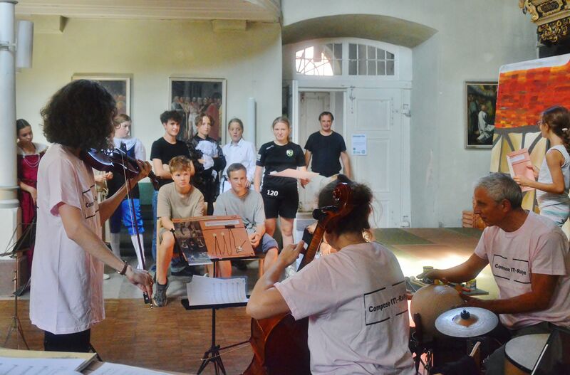 Diese individuell gestalteten Klangbilder wurden schließlich Asal Karimi (Violine), Barbara Hartrumpf (Violoncello) und Thomas Schacht (Percussion) vorgelegt und kurz mit ihnen besprochen, bevor diese zum gegebenen Input improvisierten und neue Stücke daraus schufen. Die Zuhörer wie auch die Komponisten selbst waren nicht selten erstaunt, wie viel aus den Bildern eindeutig in der Musik wiederzuerkennen war. Über einiges wurde noch einmal diskutiert, so dass der gesamte Prozess bei vielen ein tiefes Verständnis für bzw. ein intensives Nachdenken über Kreativität und Musik hervorrief.