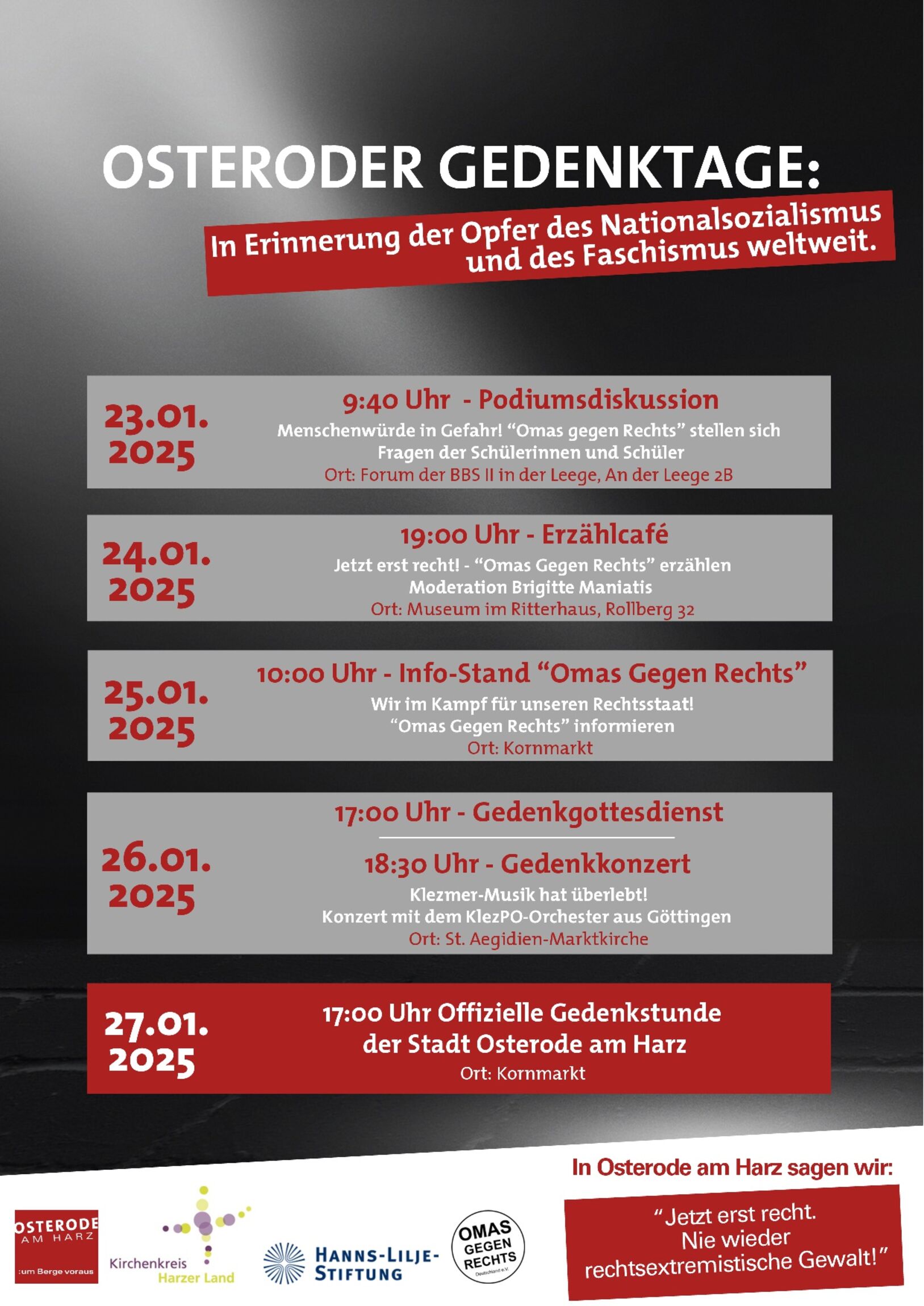 So gibt es am Donnerstag, 23. Januar, ab 9.40 Uhr im Forum der BBS II eine Podiumsdiskussion zum Thema „Menschenwürde in Gefahr“. Am Freitag, 24. Januar, findet ab 19 Uhr das Erzählcafé im Museum im Ritterhaus statt. Am Samstag, 25. Januar, haben die Omas gegen Rechts einen Infostand auf dem Wochenmarkt.