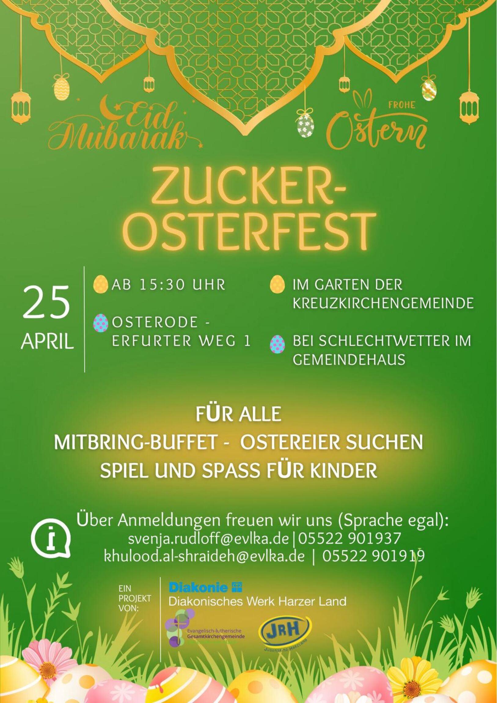 Organisiert wird das Zucker-Osterfest vom Diakonischen Werk in Zusammenarbeit mit der Gesamtkirchengemeinde Osterode und dem Jugendring Harzland. Zur besseren Planung sind daher Anmeldungen unter svenja.rudloff@evlka.de oder khulood.al-shraide@evlka.de erwünscht. Beide und das gesamte Team freuen sich sehr über möglichst viele Gäste. Bei schlechtem Wetter steht natürlich das Gemeindehaus zur Verfügung.