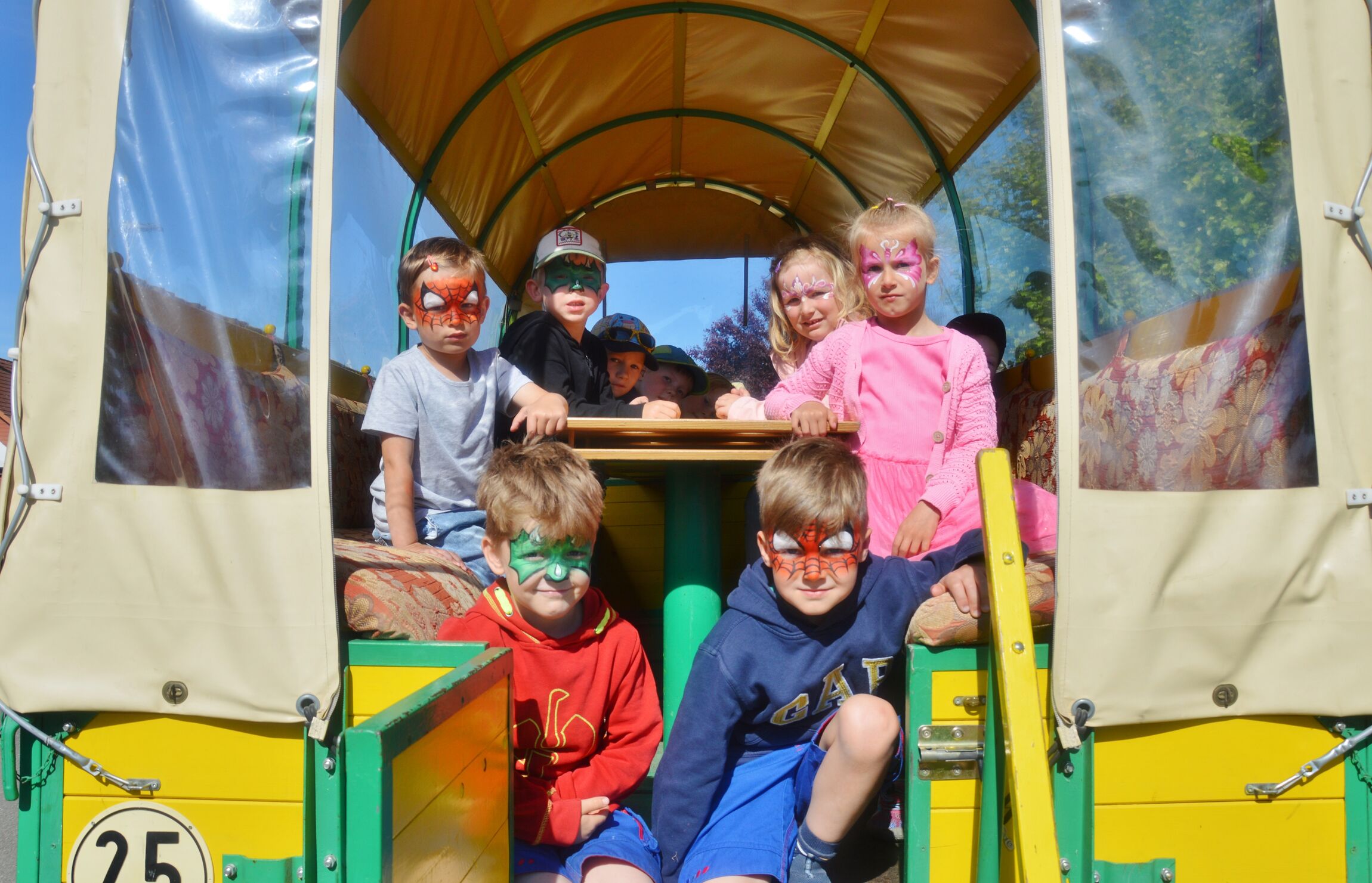 Die Kinder wachsen in den Jahren in der Kita mit dieser Stärkung für eigene Lebensentscheidungen auf, natürlich nicht theoretisch, sondern in ihrem Falle ganz praktisch mit einer Mischung aus vermittelten Werten und viel Spaß, diese auch zu leben. Dazu gehört in dieser Woche auf jeden Fall das Schminken mit Farbakadabra, wodurch sie in beliebige Rollen schlüpfen können, ebenso wie die Planwagenfahrt, mit der der Verein Dorfgemeinschaft Leben und Wohnen in Eisdorf die Kita unterstützt und durch die die Kinder ihr Dorf aus einer spannenden Perspektive kennenlernen.