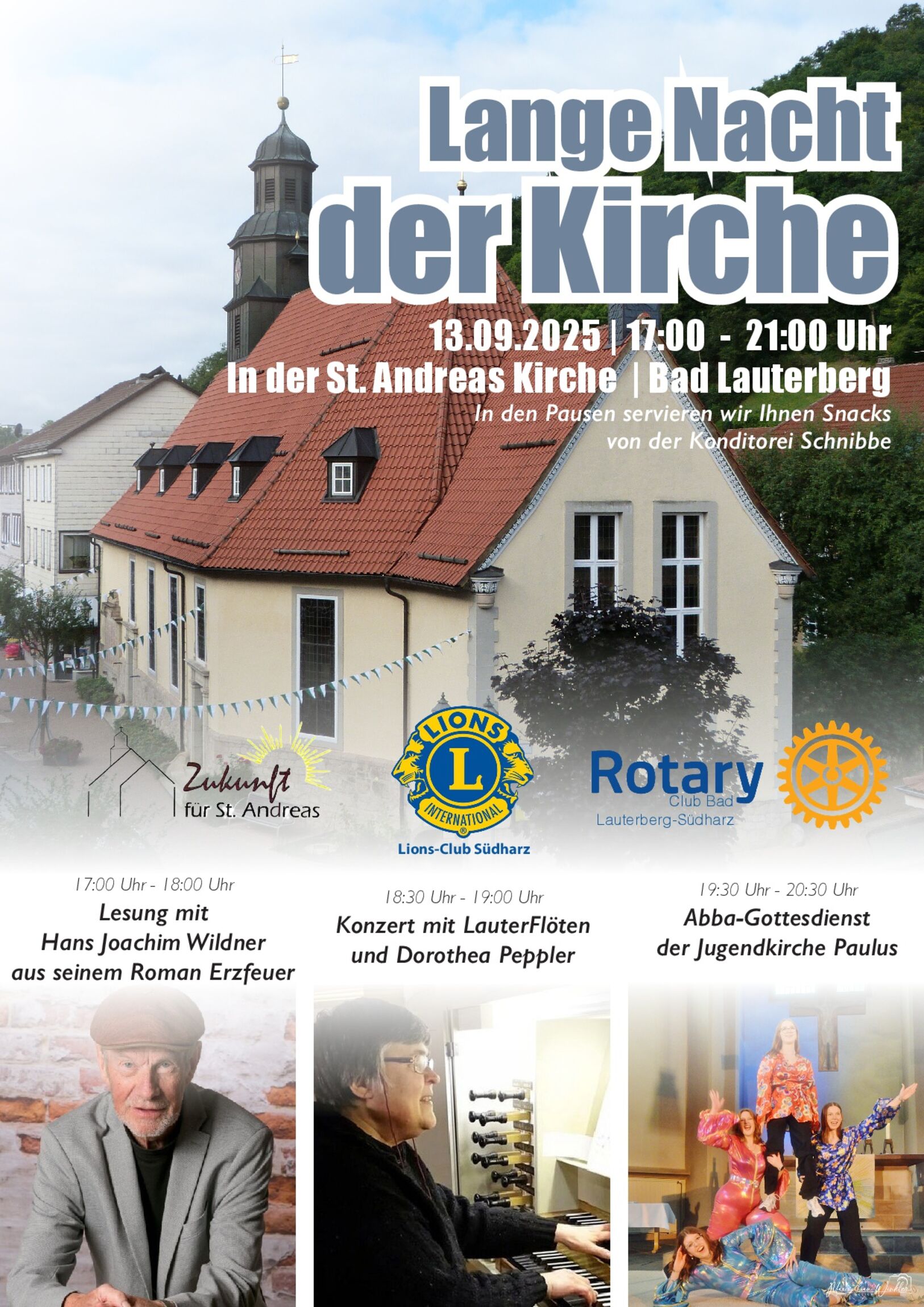 Eine Lesung, ein Konzert und den beliebten "ABBA-Gottesdienst" – all das und noch mehr gilt es bei der "Langen Nacht der Kirche" am Samstag, 13. September, von 17 bis 21 Uhr in der St. Andreas-Kirche in Bad Lauterberg zu erleben. Die Initiative dazu geht von der Stiftung "Zukunft für St. Andreas" aus, für die auch die Spendengelder an diesem Abend bestimmt sind. Dazu hat sich diese zusammen mit der Ev.-luth. Kirchengemeinde Bad Lauterberg einiges für das Publikum einfallen lassen. Den Anfang macht von 17 bis 18 Uhr Hans-Joachim Wildner mit einer Lesung zu seinem Roman "Erzfeuer", in dem auch die St. Andreas-Kirche eine Rolle spielt. Außerdem gewährt er spannende Einblicke in die Entstehungsgeschichten seiner Bücher. Sicher wird er auch etwas über sein neues Buch "Ein später Brief“ erzählen... Jedenfalls schließt sich an seine Lesung eine Pause mit Butter-Mandel-Kuchen der Konditorei Schnibbe und Kaffee an. Als nächstes steht von 18.30 bis 19.15 Uhr ein Konzert der LauterFlöten und Kantorin Dorothea Peppler auf dem Programm. In der anschließenden Pause wird Zwiebelkuchen der Konditorei Schnibbe gereicht, bevor von 19.45 bis 20.45 Uhr die Jugendkirche Paulus mit dem bekannten und beliebten ABBA-Gottesdienst ihren großen Auftritt hat. Die Jugendlichen waren damit sogar beim Kirchentag in Hannover vertreten – und der Gottesdienst musste kurzerhand per Leinwand nach draußen übertragen werden, da das Interesse so groß war und viele Besucher*innen keinen Einlass mehr in die Kirche fanden. Im Anschluss warten Wildkräuter Blätterteig-Röllchen, von der Konditorei Schnibbe in Weck-Gläsern angerichtet. Dazu können in allen Pausen alkoholfreie Schierkuja-0,0-Cocktails und Softgetränke erworben werden und es wird glutenfreie und vegetarische Finger-Foods geben, die Monika Wildner vorbereitet – alles auf Spendenbasis für die Kirchenstiftung. „Wir freuen uns sehr über dieses neue Format – und viele Besucherinnen und Besucher. Dank geht an die Konditorei Schnibbe und Familie Möller von Schierker Feuerstein für ihre großzügigen Essens- und Getränkespenden und an Maximilian Winkler für die Plakatgestaltung“, sagt Oliver Eckstein als Stiftungsvorsitzender. Auch Pastorin Vanessa Bethe ist schon gespannt und richtet ihren Dank an den Stiftungsvorstand und alle Mitglieder der Stiftung: „Wir freuen uns sehr, dass wir auch als fusionierte Kirchengemeinden St. Andreas und Paulus so zuverlässig auf die Stiftung zählen können. Lassen Sie uns gemeinsam einen schönen Abend genießen!“