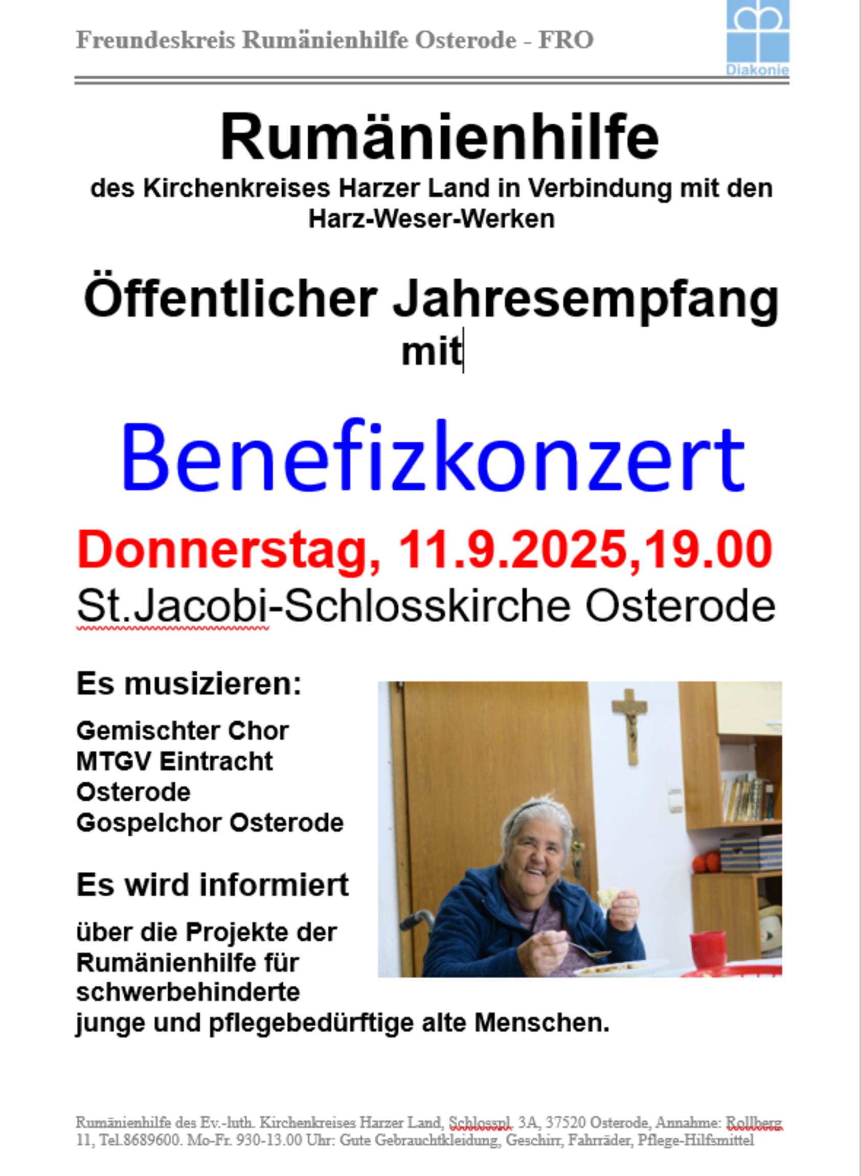 Die Rumänienhilfe des Kirchenkreises Harzer Land in Verbindung mit den Harz-Weser-Werken veranstaltet am Donnerstag, 11. September, um 19 Uhr einen öffentlichen Jahresempfang mit Benefizkonzert in der St. Jacobi Schlosskirche in Osterode. Der Gemischte Chor MTGV Eintracht Osterode und der Gospelchor Osterode treten auf. „Zudem wird über die Projekte der Rumänienhilfe für schwerbehinderte junge und pflegebedürftige alte Menschen informiert“, so die Verantwortlichen des Freundeskreises Rumänienhilfe Osterode. Die Rumänienhilfe, am Rollberg 11 in Osterode, nimmt aktuell gute Gebrauchtkleidung, Geschirr, Fahrräder und Pflege-Hilfsmittel an – gerne vorher unter Tel. 05522-8689600, Montag bis Freitag von 9.30 bis 13 Uhr, durchrufen und absprechen. Infos zum Verein unter: