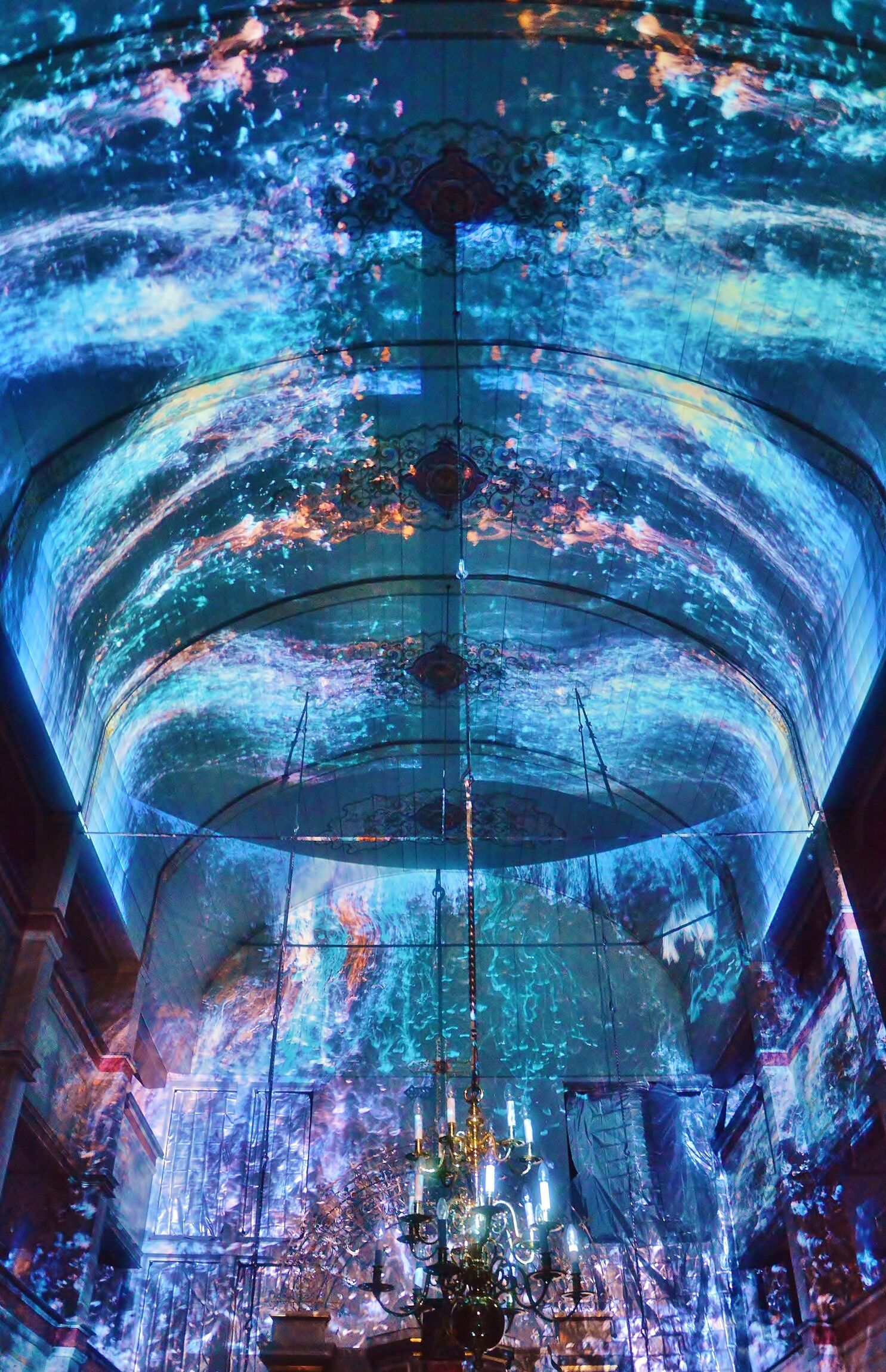 Das Kirchenschiff in vollkommener Dunkelheit. Doch dann flackern Lichter über den Altar, die Wände und die hohe Decke. Lichter, die sich als Schemen immer wieder neu formen, deren Farben sich wandeln, die vollkommen surreal wirken. Durch die Dunkelheit ist die Kirche selbst kaum auszumachen, es scheint als verändere sich der Raum mit den Farben und Formen, gewinne immer wieder an Weite, es entsteht die Illusion von Unendlichkeit.