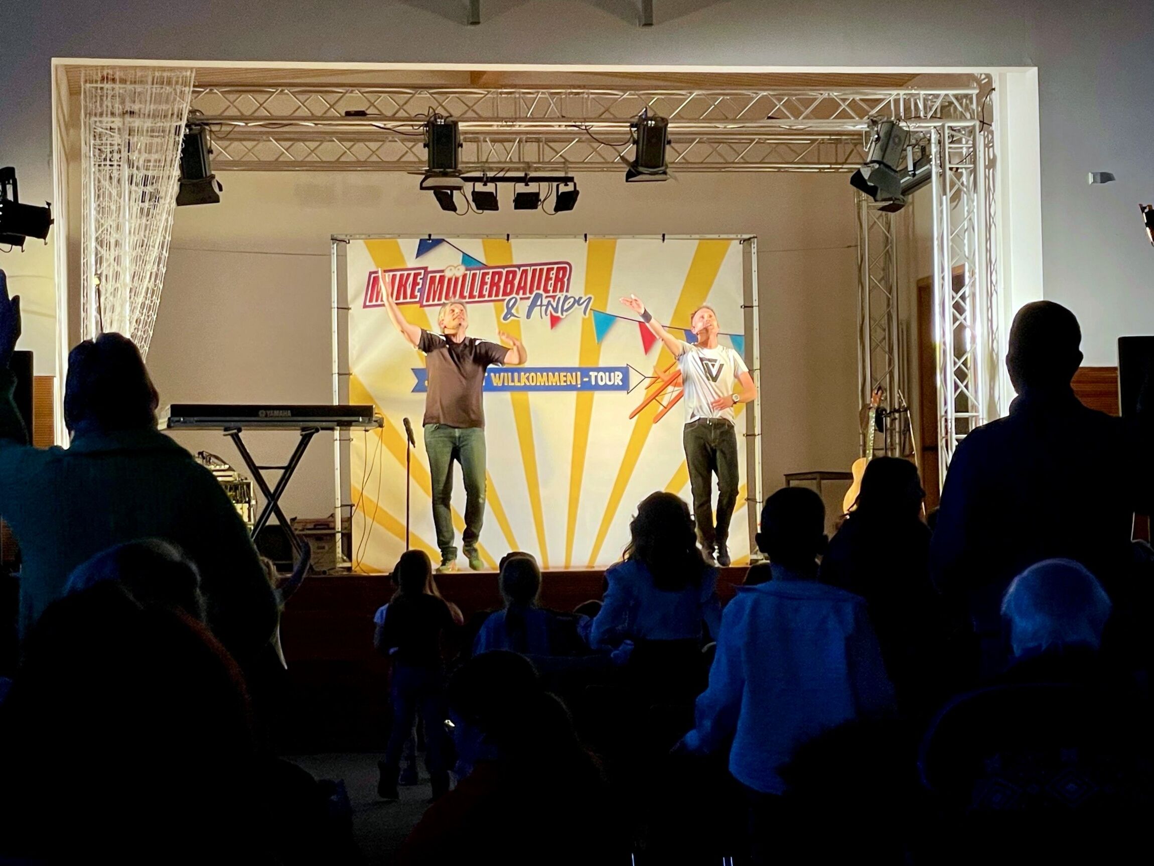 Nicht nur die Kleinen waren begeistert! Auch die größeren Gäste wie Mamas, Papas, Omas, Opas, Tanten und Onkel ließen sich schnell mitreißen von der Freude und Begeisterung. Der Kinderliedermacher und sein Bühnen-Partner begeisterten mit eigenen, christlichen Songs mit Herz und Köpfchen wie „Komm, wir machen Gott jetzt eine Freude“ oder „Sei mutig und stark“, humorvollen Texten, viel Groove und Lebensfreude, aber auch ruhigeren Stücken und sogar einem mit Gebärdensprache. Genau diese Vielfalt begeisterte die Gäste so sehr, dass Sie sich gerne von Mike Müllerbauer zum Mitmachen einladen ließen und es sie kaum auf ihren Plätzen hielt. Neben der Musik haben Mike und Andy lustige und mutmachende Beiträge (zum Teil auch verkleidet) präsentiert. Es gab einen roten Teppich für einige Kinder aus dem Publikum, die stellvertretend für alle Anwesenden zeigen durften, dass Gott uns alle alle wunderbar gemacht hat. Und sogar ein Projektchor trat bei diesem Konzert auf. Kantorin Margret Kernbach und die Grundschule hatten dazu einen Aufruf gestartet. Musikbegeisterte Kinder waren der Einladung gefolgt, vor dem Konzert zwei Mal einige Lieder des Mitmach-Konzertes gemeinsam zu proben und so standen sie kurzerhand bei den letzten 4 Liedern mit den Künstlern und Bewegungsmacherinnen gemeinsam auf der Bühne und bekamen wohlverdient einen riesigen Applaus.